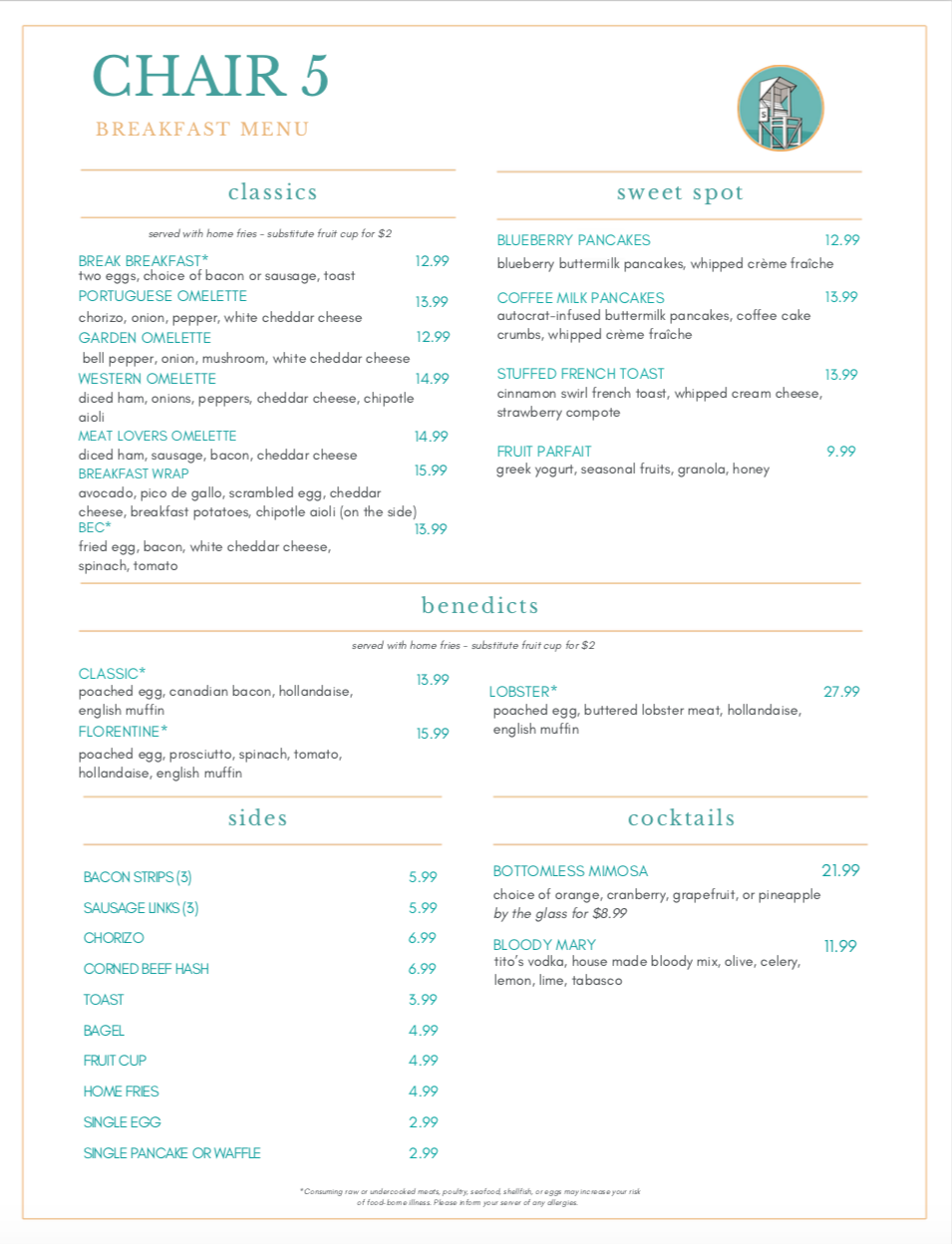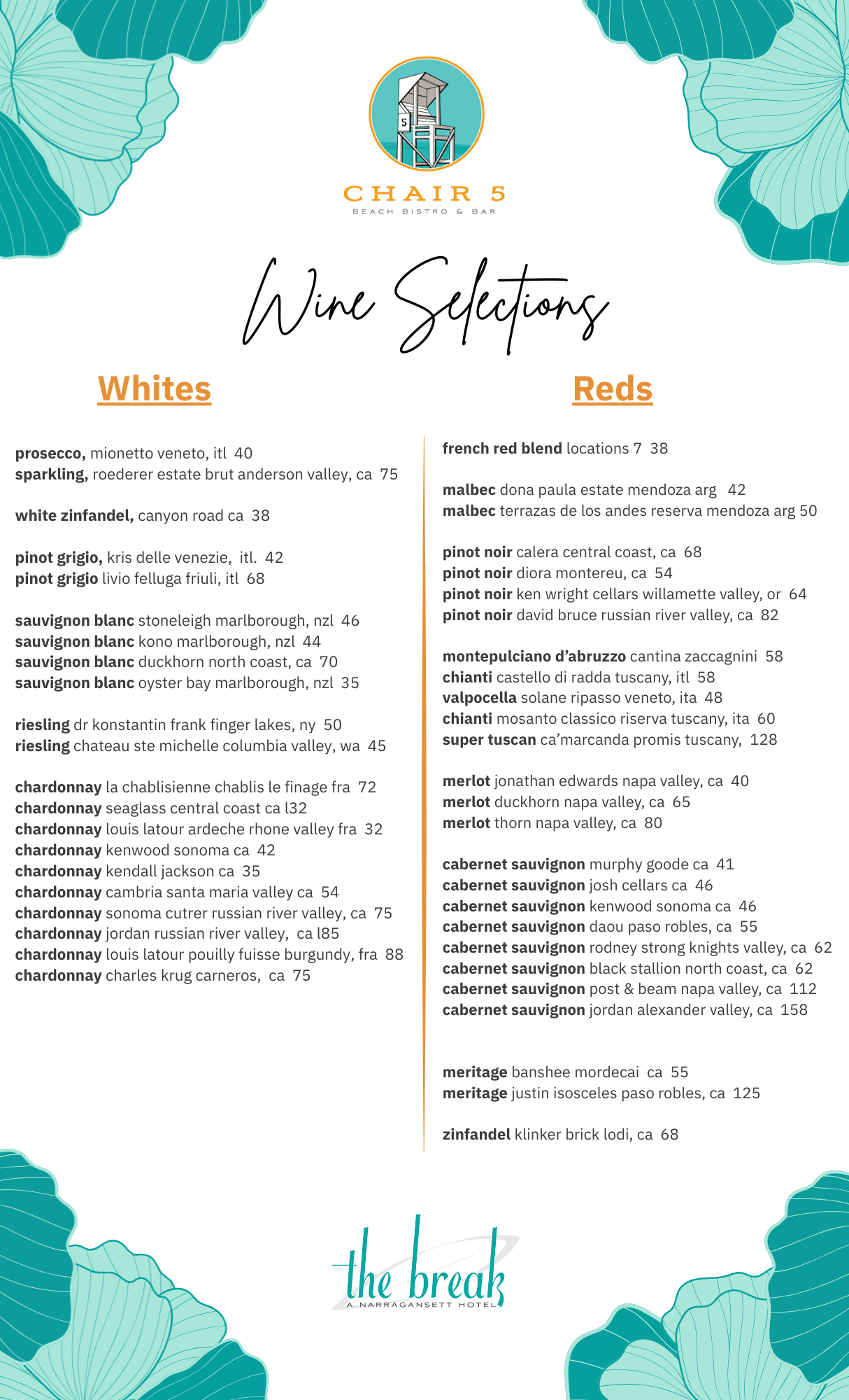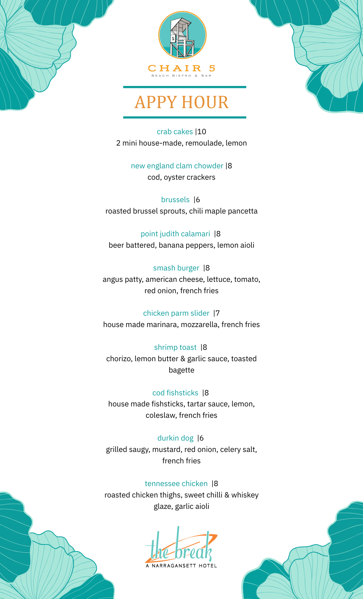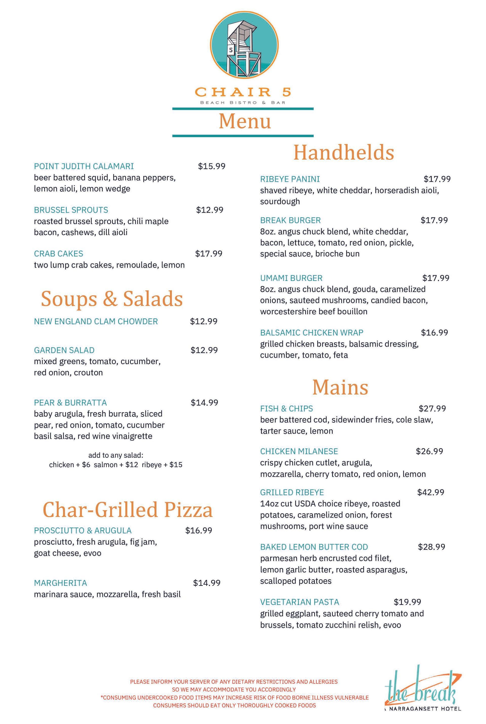 Chair 5 is an elevated – yet casual – beach inspired restaurant serving Rhode Island classics & fresh, delicious dishes. You’ll enjoy the food as well as the surfer-chic vibe, ocean views, and fabulous craft cocktails! Menus listed below.